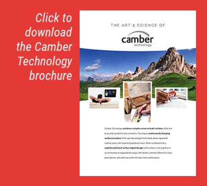 Camber technology combines complex variable curves on both surfaces of the lens to provide exceptional clarity to the wearer's vision. The result is a continuously changing curvature between the front and rear surfaces expanding the reading zone and vastly improving peripheral vision. The technology fine tunes or compensates the supplied RX to give optimum performance at the patient's unique position of wear. When wearing Define lenses, the wearer also benefits from superior near vision performance and better cosmetic appearance.